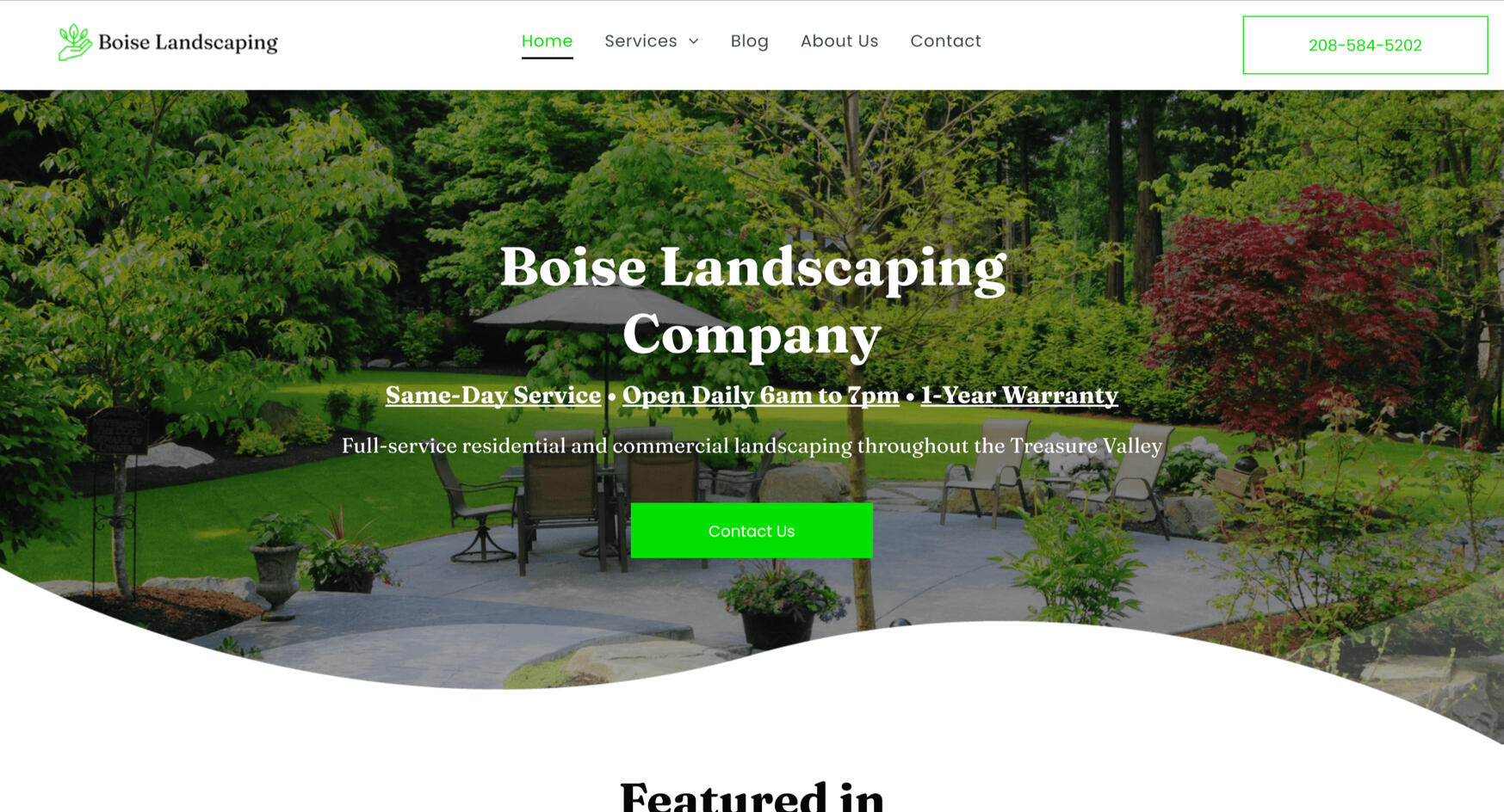 Boise Landscaping Company was our very first client. After 5 months of our Accelerator package, they now rank first for both "Boise Landscaping" and "Landscaping Boise", two of the highest traffic keywords. They are also ranking on the first page of various other keywords which bring them even more traffic.